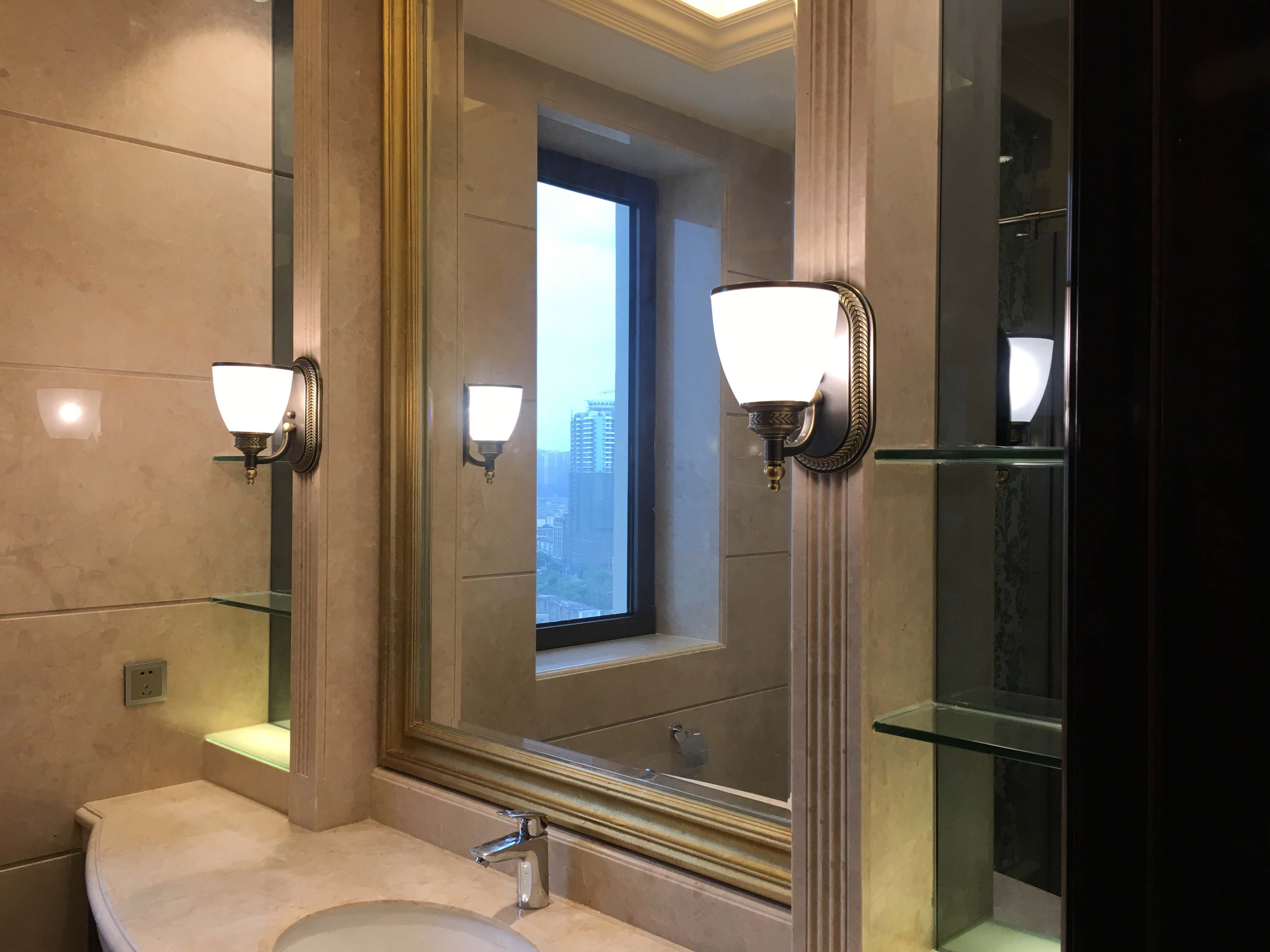 在通常情況下,如果鏡前區域的燈光沒有過多的要求,那麽可考慮在鏡麵的左右兩側安裝壁燈。如果條件允許,也可在鏡麵前方安裝吊燈或者三頭鏡前燈,這樣一來,燈光可直接灑向鏡麵。但同時要保證照明光線的柔和度,否則容易引起眩光。